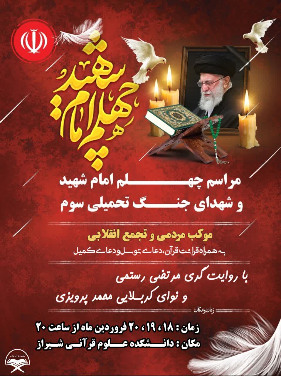 مراسم بزرگداشت چهلمین روز شهادت رهبر کبیر انقلاب اسلامی حضرت آیت‌الله العظمی سید علی خامنه‌ای‌ (قدس‌سره‌الشریف)، و تمامی شهدای گرانقدر جنگ تحمیلی رمضان، دانش‌آموزان عزیز دبستان شجره طیبه میناب و سرداران سرافراز، طی سه شب در ورودی دانشکده علوم قرآنی شیراز برگزار گردید.